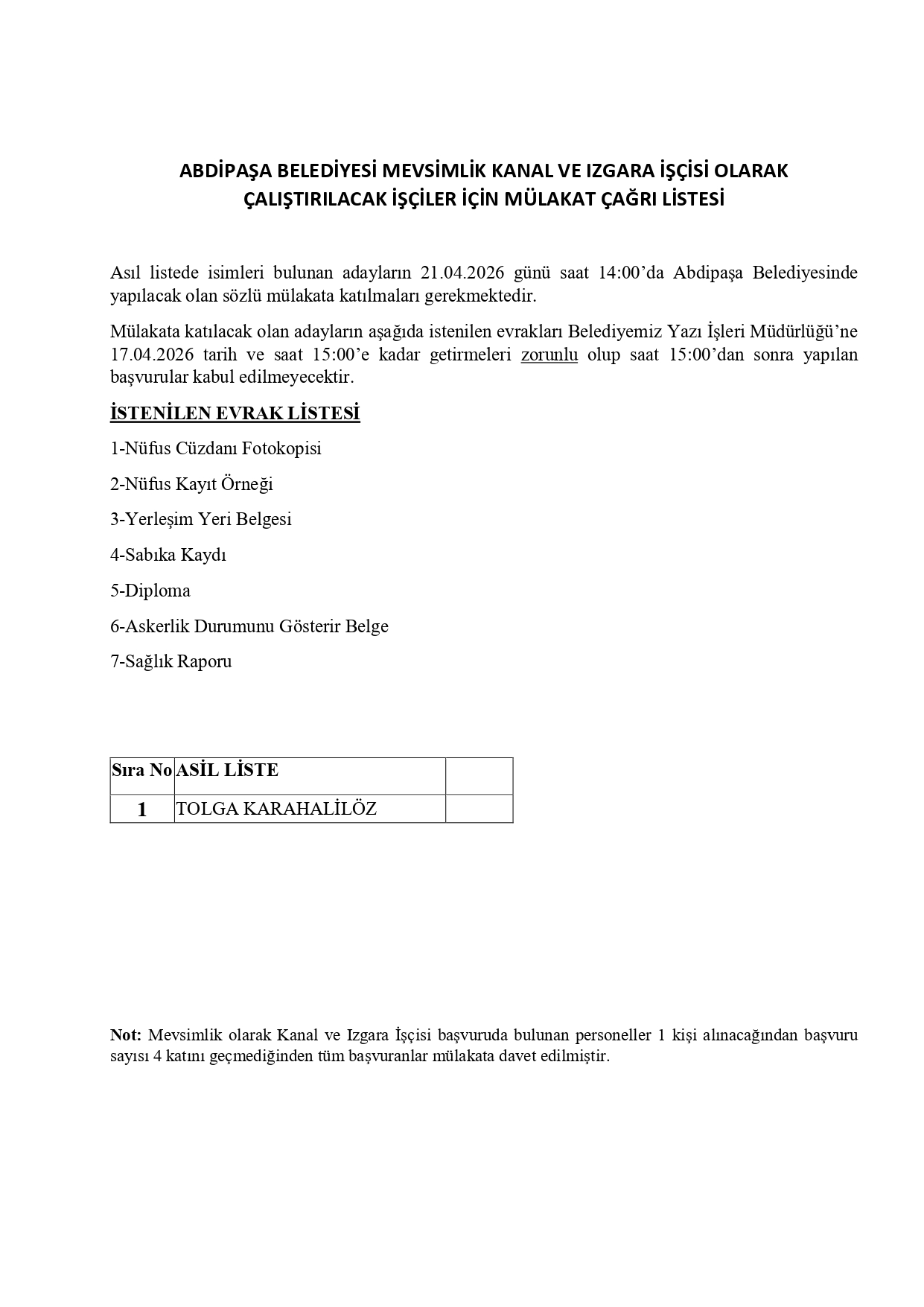 MEVSİMLİK KANAL VE IZGARA İŞÇİSİ OLARAK ÇALIŞTIRILACAK İŞÇİLER İÇİN MÜLAKAT ÇAĞRI LİSTESİ MEVSİMLİK KANAL VE IZGARA İŞÇİSİ OLARAK ÇALIŞTIRILACAK İŞÇİLER İÇİN MÜLAKAT ÇAĞRI LİSTESİ